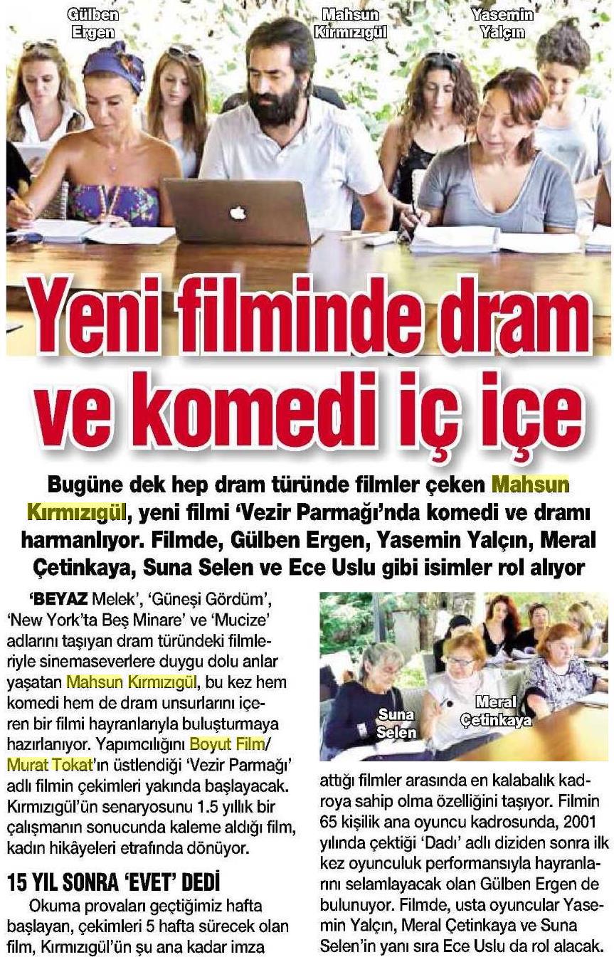 Bugüne dek hep dram türünde filmler çeken Mahsun Kırmızıgül, yeni filmi 'Vezir Parmağı'nda komedi ve dramı harmanlıyor. Filmde, Gülben Ergen, Yasemin Yalçın, Meral Çetinkaya, Suna Selen ve Ece Uslu gibi isimler rol allıyor